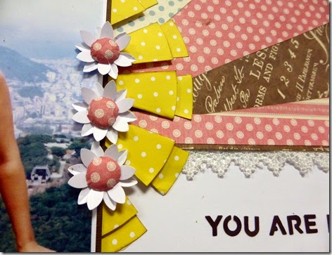 Layout One – A close up 4” x 6” portrait photo of Sally and me in the summer. The colours for this layout are soft orange, green and brown.